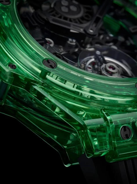 After having mastered the techniques of crafting its top replica watches – both cases and movement components – in sapphire crystal and it the numerous colours it can take on, there are limits to the hues and colour intensities it can adopt. To produce an emerald-like green transparent material, Hublot and its teams of researchers and metallurgists had to look elsewhere. The answer came far from the world of watchmaking in the form of SAXEM (Sapphire Aluminium oXide and rare Earth Mineral), a material that was originally conceived for satellite technology. While it does boast many of the same properties to sapphire such as hardness and transpareny, it’s different on a molecular level. While both are made of aluminum oxide, SAXEM is combined with rare earth elements. Its also structurally different, as sapphire is trigonal (three-sided) while SAXEM is cubic (four-sided). This subtle but significant distinction allows for SAXEM to take on intense colours and shine brilliantly, like a precious gemstone.