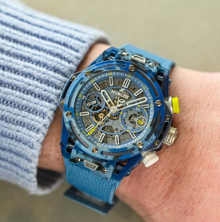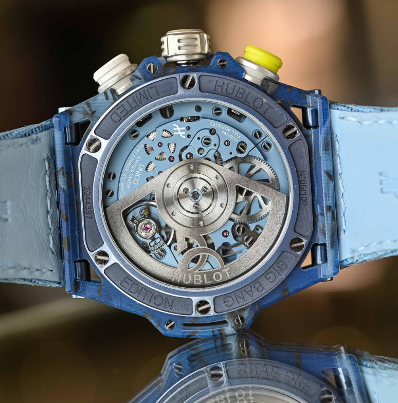 Not only was the case reworked to lighten its load, but the movement was also revisited with lightweight anodised aluminium. Powered by the HUB1280 Unico manufacture automatic 4Hz integrated flyback chronograph calibre with column wheel with a 72-hour power reserve, the brass components were replaced with lightweight aluminium anodised in light blue to match the camo colour scheme of the case and reducing the weight by almost 27%.