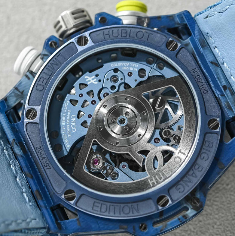 Keeping the watch featherlight has produced modifications to the external components of the case, many of which are made from lightweight aluminium. The lateral protective bumpers are not solid but hollowed out, a feature that has been applied to the bezel, the lugs and even the strap attachment module. In the pursuit of lightness, Swiss Hublot fake watches has also switched the traditional sapphire crystal for tempered Gorilla glass, a material that is two times lighter than sapphire.